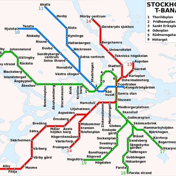 ( 瑞典 语:Stockholms tunnelbana英语:Tunnelbana Metro)该系统由3条主要线路组成(绿线、红线、蓝线),7条次要线路(T10、T11、T13、T14、T17、T18、T19),以及多种区间线路。