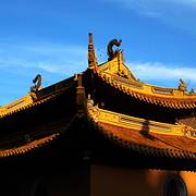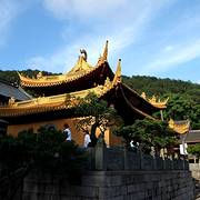 灰瓦黄墙的法雨寺创建于明万历八年,因当时此地泉石幽胜,结茅为庵,取“法海潮音”之义,取名“海潮庵”,清康熙三十八年兴修大殿,并赐“天花法雨”匾额。 法雨寺依山取势,分列六层台基上。入山门依次升级,中轴线上有天王殿,后有玉佛殿,两殿之间有钟鼓楼。依次为观音殿、御碑殿、大雄宝殿、藏经楼、方丈殿。 法雨寺最值得一看的就是金碧辉煌的九龙殿,檐角的九龙雕刻十分精致生动,殿内的九龙藻井及部分琉璃瓦从南京明故宫**而来,被誉为普陀山四宝之一。