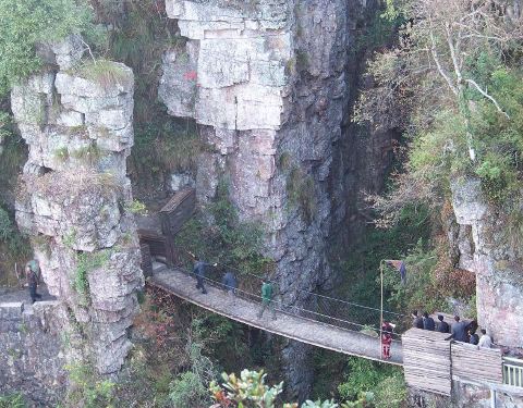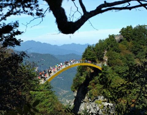会仙桥在靠近山顶的分支上,从小路走下去需要15分钟左右,爬山有点累,到风景绝对值得会仙桥在靠近山顶的分支上,从小路走下去需要15分钟左右,爬山有点累,到风景绝对值得。桥架在两块岩石之上,桥下是万丈深渊,有点悬空的感觉,很像仙境一般,果然是会仙桥。