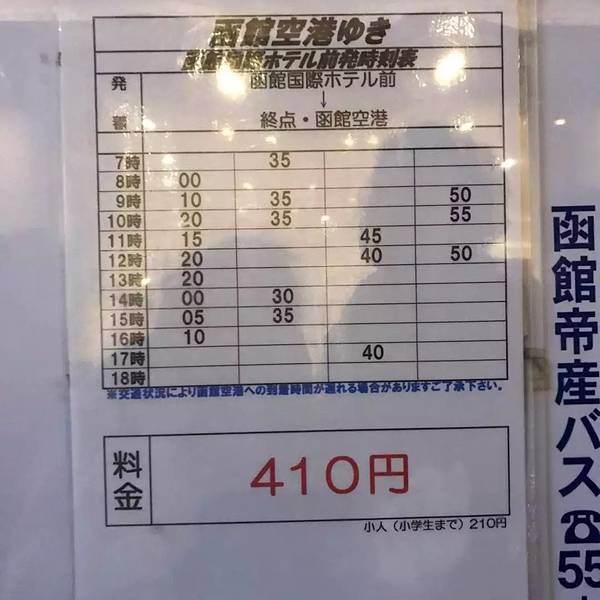 最后一天的早餐放弃了,我是真心起不来呀!所以起来收拾收拾就退房了,去便利店买我最爱的饭团,然后去坐到函馆机场的巴士。 从函馆到机场有机场巴士,离我们住的酒店最近的站点是在函馆国际酒店门前,离我们住的酒店步行五分钟就到了,出门向左直走过一个红绿灯就到函馆国际酒店。这个巴士有好几个站点,JR站也有,其他的站点我都不清楚,不知道叫啥,可以地图看一下,巴士有人会帮放行李,上车付钱就行啦!大概半小时左右就到函馆机场了! 下图乘车时间表!(照片是我前一天晚上去踩点时照的!)
