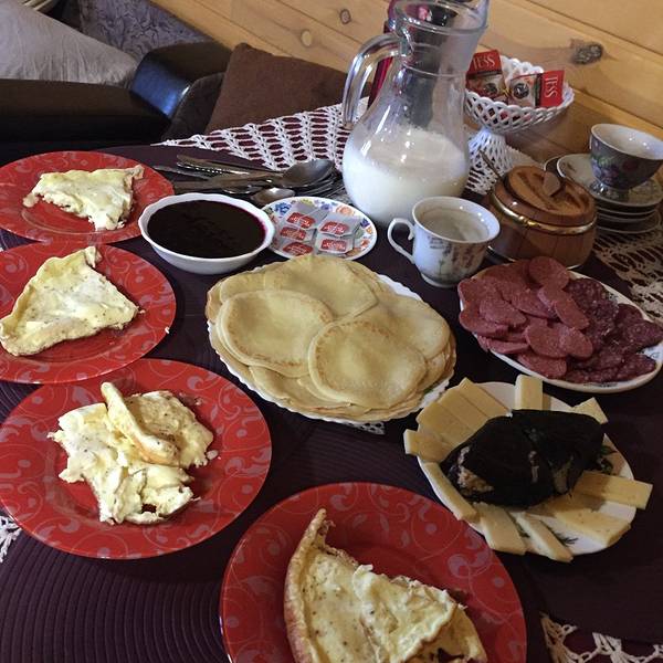 没拍房间,因为摆满了行李!(哈哈哈哈)住得很开心!从远处看,右上角靠近山的房子,就是我们住的民宿。老板家的狗狗lucy,是老板在伊尔库茨克捡来的。给我们带来很多欢乐。早饭是Sergei亲自做的,其实很简单。不过吃了几天极地木屋的早饭(其实没吃,吃不下),这个鸡蛋饼简直人间美味。坐着sergei的面包车,我们出发一日游!