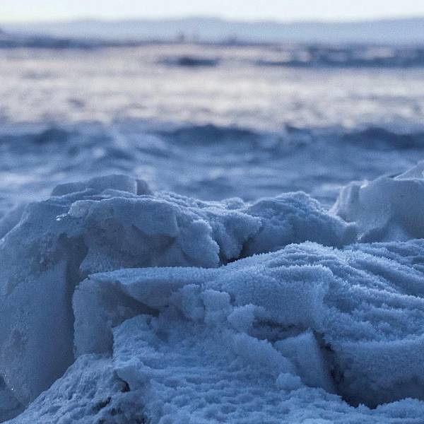 不知该怎么形容夕阳下见到的这片景象,脚下所在的这片山坡之下就是湖,湖水早已在西伯利亚的寒流中结成牢固的冰面,冰面和山体相接处,依稀可见层层大风吹过的形状。片刻间眼前仿佛看到头年下半旬的气温骤降初期,这块冰面开始逐渐扩大,而岸边的流水终于在一次大风的夜间凝结成冰,还保留着风与岸的痕迹。