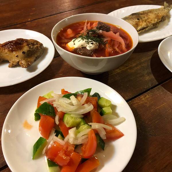 客人在店里墙上贴自己国家的纸币是当地的一种习俗,餐馆民宿里都看到过。上菜了,看起来也不错也!炸贝尔加湖鲑鱼,红汤看起来都挺诱人。