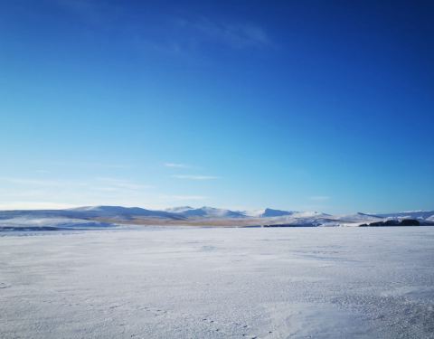 站到高处,看远方,一望无际的地方都是静谧的冰面和错落的山,湖面上偶有小车驶过。眼前这番画面,只觉得心中一切都开阔了起来,所谓'荡胸生层云'可是如此?不自觉想更近距离融入这个 大湖 中,寻小路下到冰面。小心翼翼地踏上湖面的那一刻,鞋底接触到冰面时的刺啦声在周遭空阔安静里愈发清晰入耳,冰面坚硬,虽然穿着冰面防滑靴,还是带着担心摔倒的脚步小心试探,每一步都走的很谨慎。