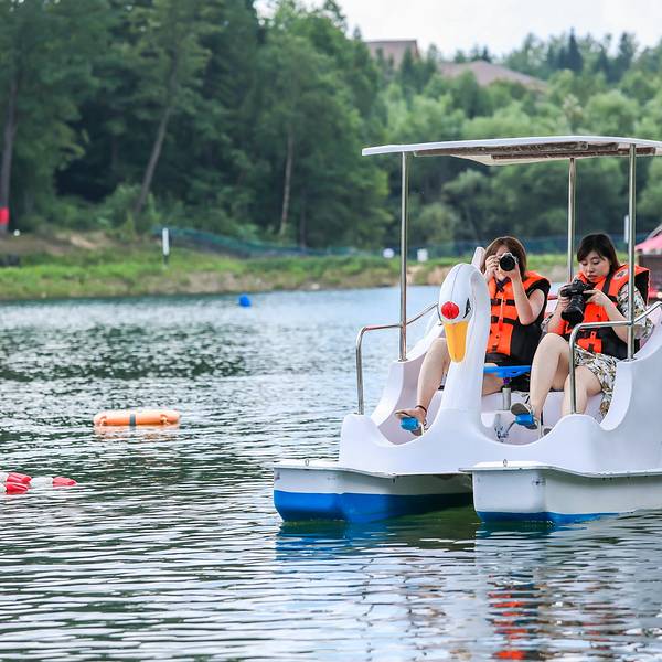 从套房假日酒店向外望去那一片碧绿的水面便是佛库伦湖了。我们先去体验了湖上索道项目,小伙伴们都不太敢上,我是第一个上去的,坐上去的一刹会有些害怕,但是滑下来的时候才发现其实很平缓。到对岸乘坐小船游于佛库伦湖上,船随水波摇曳,湖中倒影青翠,十分惬意。还可以乘坐游船在湖面用餐,想必一定很有情调,无奈我们人数过多,一艘船承载不下,只好作罢。