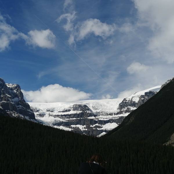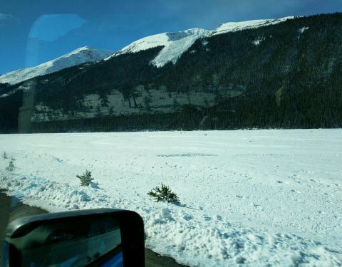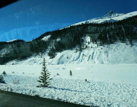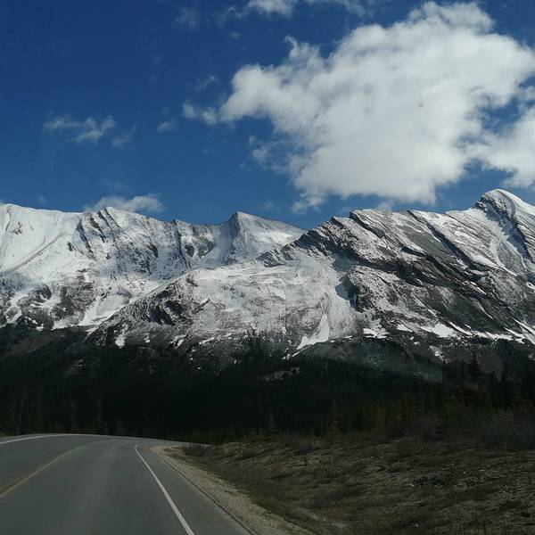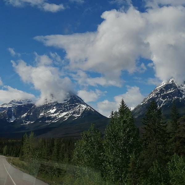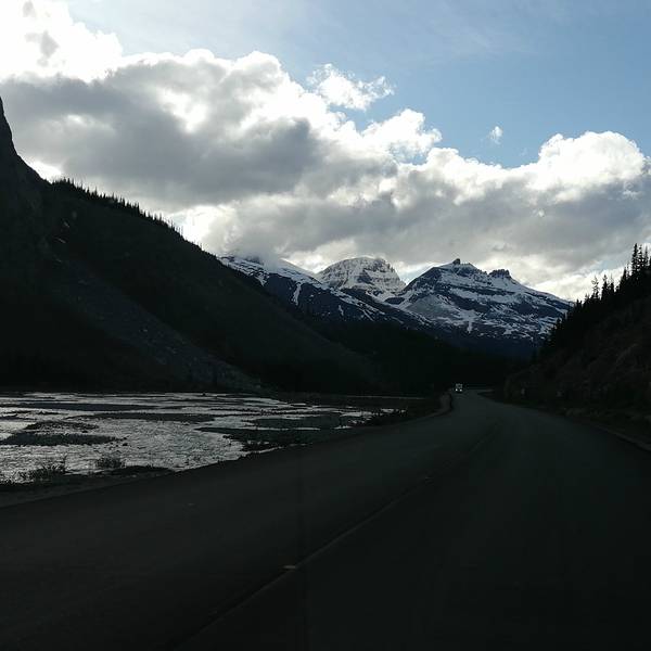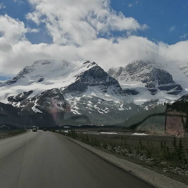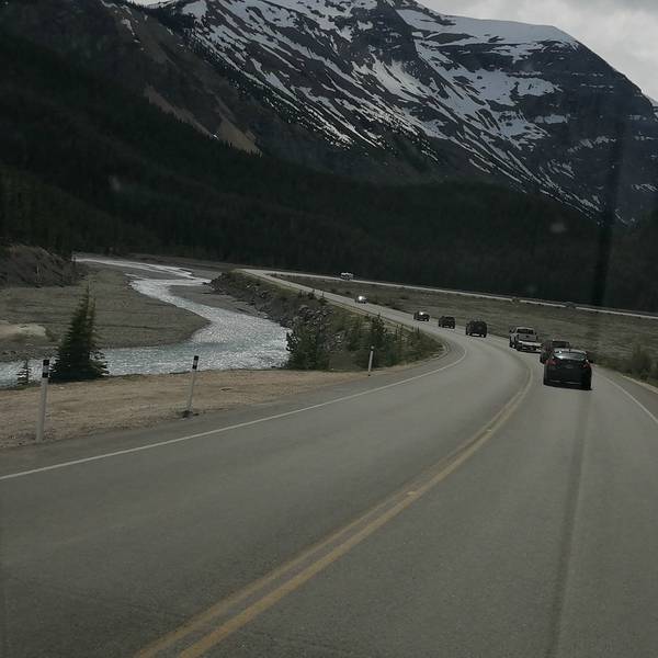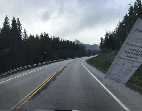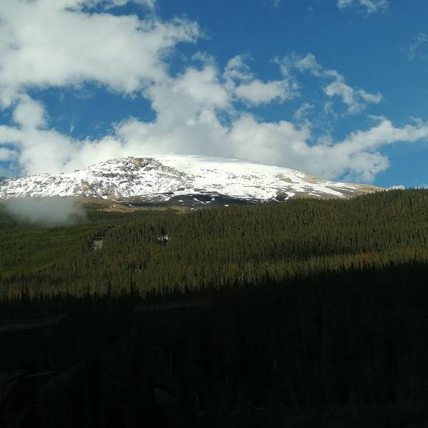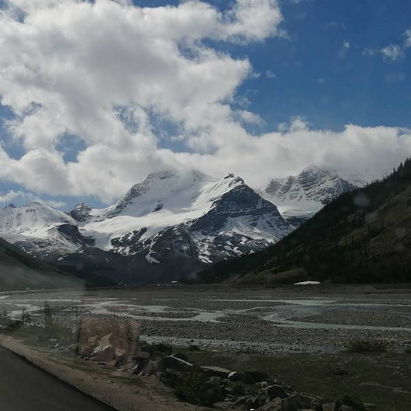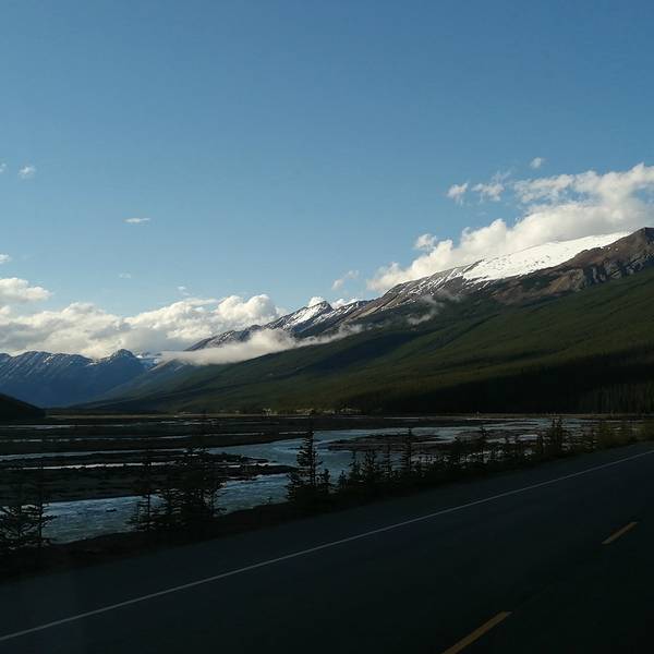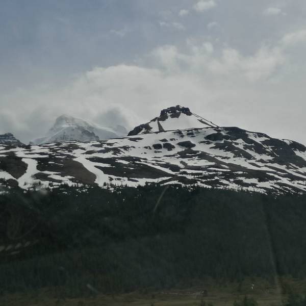 风比较大,雪山展现给我们另一番景象不知是云走的太快还是风吹起了积雪...今天要准备离开Jasper啦,因为我们的大路线是人字形的(见头图)所以有一段等于是往回走,正好补上冰原大道中间一段被我们睡过去的风景😜