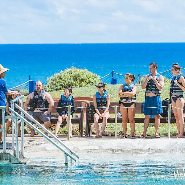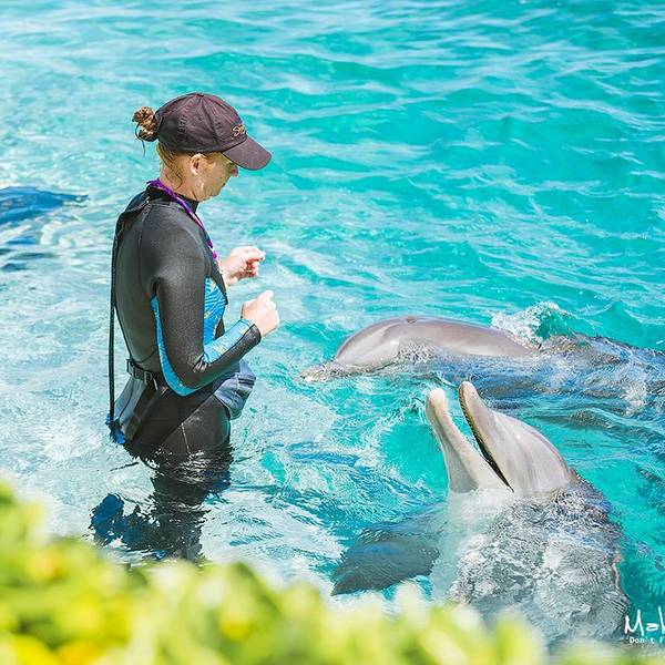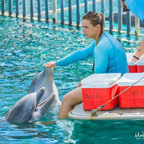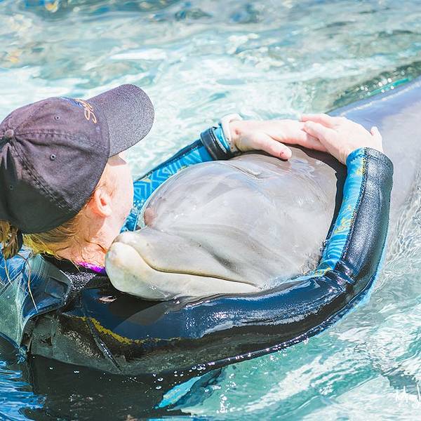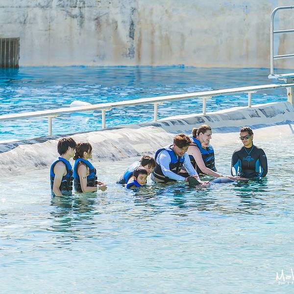 这是一次与海豚亲密互动的机会,在及腰深的水域拥抱并亲吻海豚,