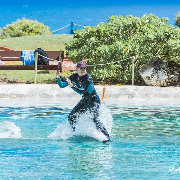 获得了充分的信赖之后,哪怕是人站在海豚上冲浪都是可以的。12点30分,最受欢迎的海豚表演就开始了,