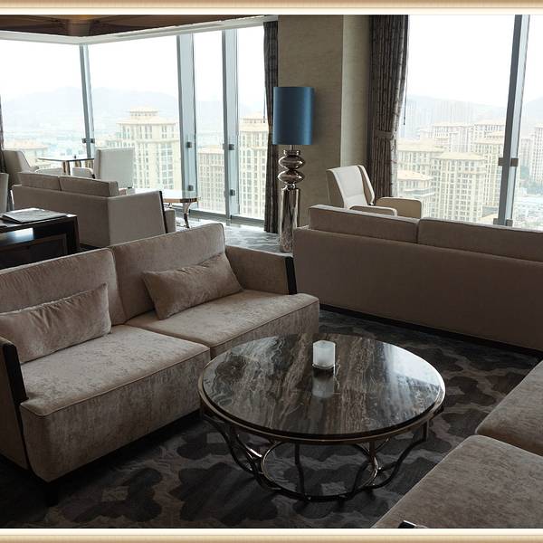 第一次入住绿城喜来登酒店,绿城集团一直号称是良心业主,此次体验果然比较厚道,首先第一次入主的金卡会员就赠送了行政酒廊待遇。***位置及交通:行政酒廊位于酒店的顶层,正对着酒店旁边的人工湖,视野很好。青岛李沧喜来登酒店位于青岛李沧区金水路上,地理位置稍微有些偏,到青岛的市中心市南区和青岛的机场的距离差不多远,都要半个小时左右,青岛暂时没有地铁,只能搭乘公交或打车,本人是拼车前往,很方便,推荐小伙伴们尝试。***酒廊环境:酒廊的环境很不错,简约大气,进门是两个宽敞的沙发组合座,白色的色调很温馨,坐着很舒适。左手边是餐饮区,Happy Hour主要是在这里,座位比较多。再往里面又是沙发休闲座位为主,布置得很合理。进门的右手边是客用上网区及会议室。***餐饮:平时有饮品提供,汽水和巴黎水,咖啡全有,但可惜没什么小吃。Happy Hour有热食,选择还是蛮多的,味道也不错,而且由于早餐一层的餐厅选择也不是很多,也可以考虑在酒廊里享用,景色相对更好一些。***服务:服务员每次只有一个人,但服务态度很好,很负责任,赠送了两瓶巴黎水,并道歉饮料不够冰,服务很细,赞一下!***不足:不过有一点美中不足的是,酒廊内不能办理Check In 和 Check Out,希望以后可以改进。 ***结语:环境很好,景观很好,如果有时间泡在酒店,一定要上来坐坐。