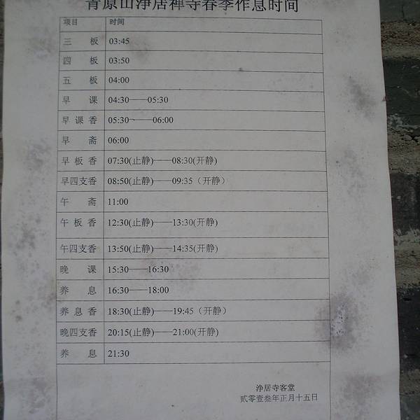 进“祖关”不远,就出现了一座大寺庙,正在全面维修中,庙门还依旧开放。此寺据说有一千多年历史,正门上“青原山”三个字乃文天祥所题。内门“净居寺”三字是赵朴初所题。门联写着:“净水犹有曹溪味,居处常思祖师禅。”是一副藏头联。烧香时,一个老和尚对我说香炉里只许插三炷香,我按照他的说法,殿前殿后每个香炉都插了三炷香,刚好插完,一根不剩,也一根不单。看来烧香也大有讲究。 在寺内院墙上发现贴着一张春季作息时间表。早课时间是凌晨4点半到5点半,真早。6点吃早斋,11点午斋。晚课是15点半到16点半,16点半到18点养息,接着是养息香,21点半再次养息。居然没有晚斋,看样子他们一日只有两餐。果然是清苦清修,早睡早起,很有规律。