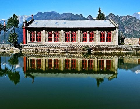 夕阳西下,倒影水中,一切美轮美奂,背后有大山的衬托,更显它的独特