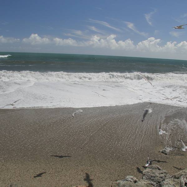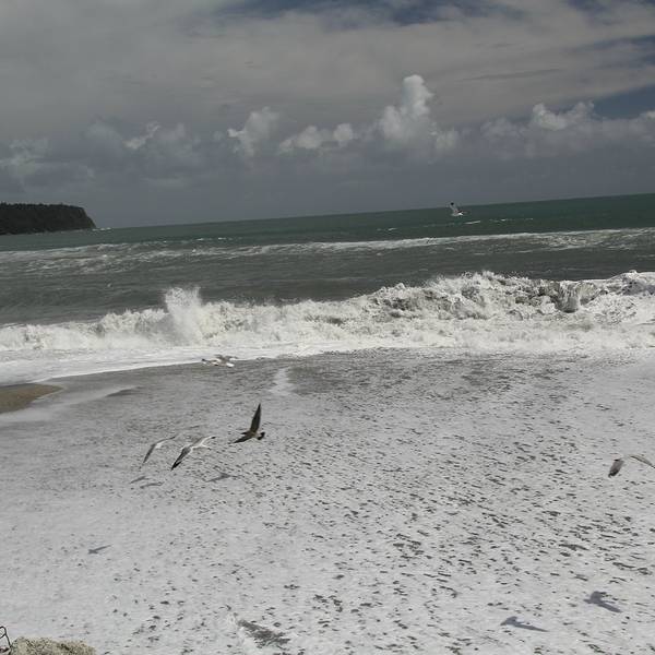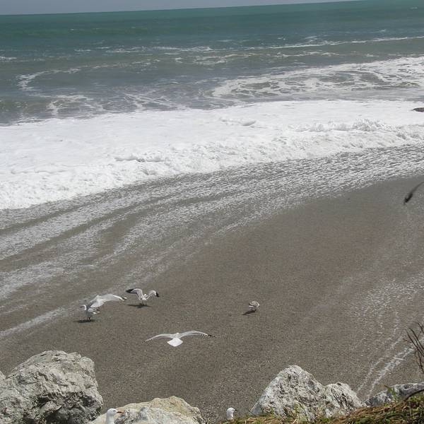 告别fox,来到bruce bay,海浪...告别fox,来到bruce bay,海浪卷起的海雾很大海边很多成堆的白色石头,上面写满了祝福语