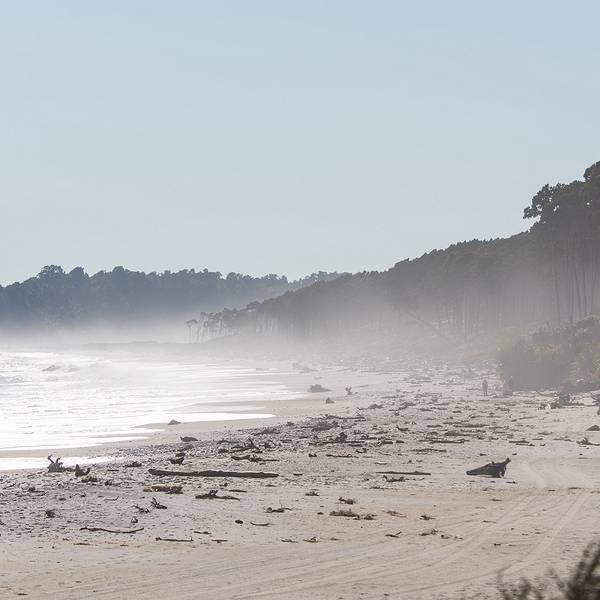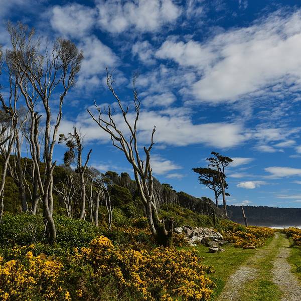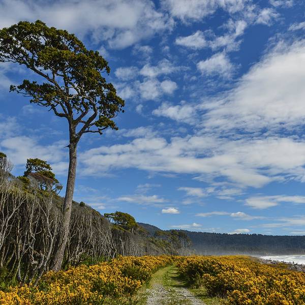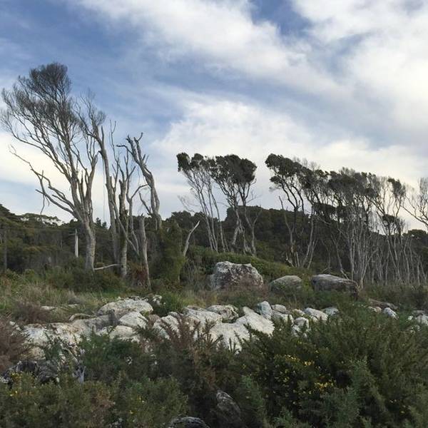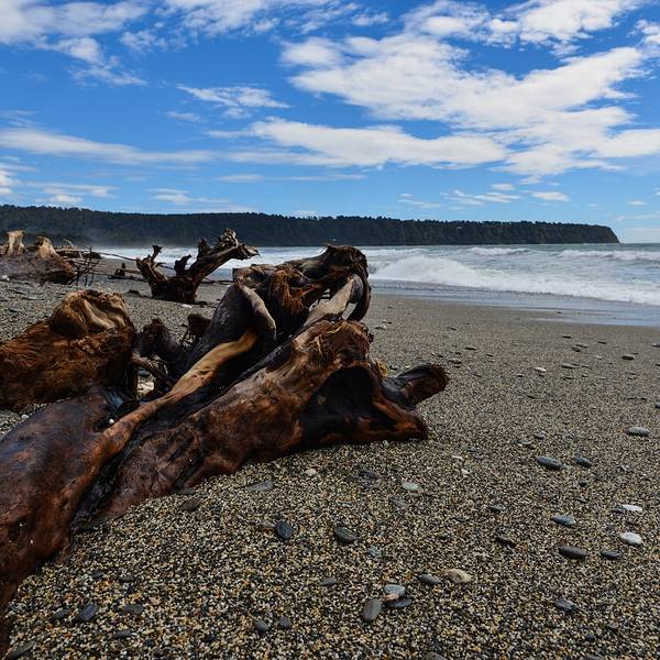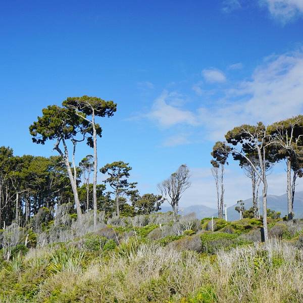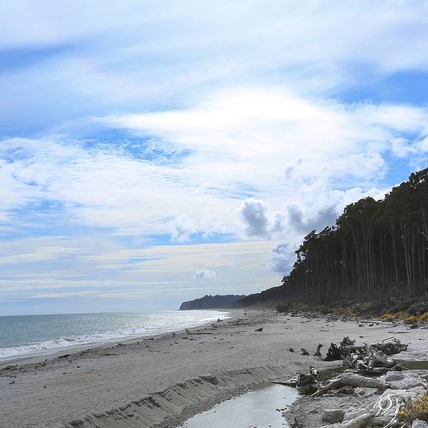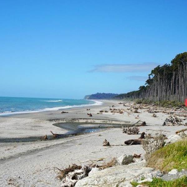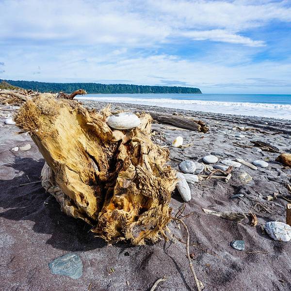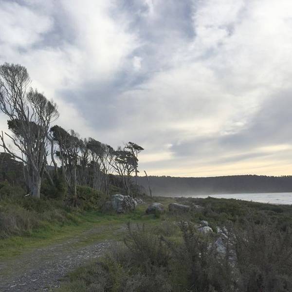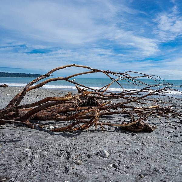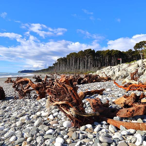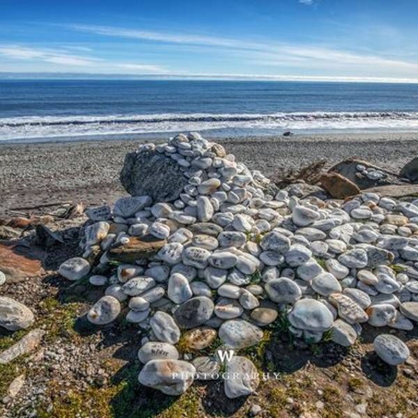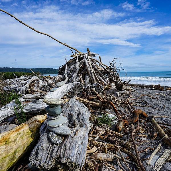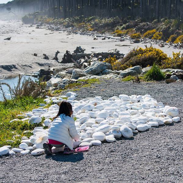 到了这把年纪,对沧桑、荒凉的感受远强于鲜花盛开、郁郁葱葱的美景布鲁斯海湾Bruce Bay以百多年前到访的一艘蒸汽船命名,岸边的树被劲风吹倒向一边,沙滩上有海水冲上来的自然漂流木和形状奇怪的圆石,路边是游人用洁白的卵石摆成的各种造型。