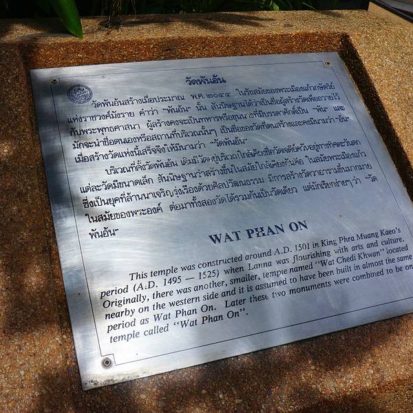 Wat Phan On建于兰纳风格文化艺术繁盛时期的1501年,在Wat Phan On寺庙的西边有另一座叫Wat Chedi Khwan的寺庙,与Wat Phan On同时期建造,后来将这两座寺庙统称为“Wat Phan On”。