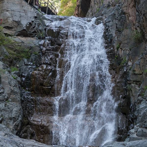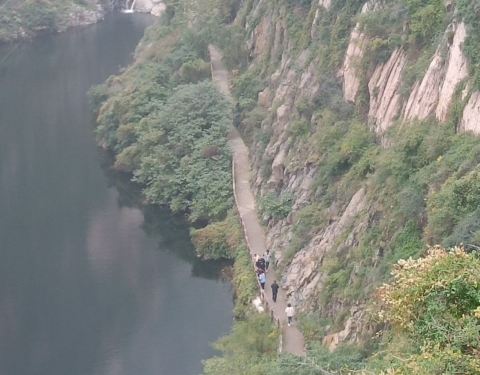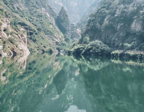 景区大门,牵马的这两位是演员,每天下午有演出,关于三国的,但是我们时间紧,没有去看。大门外有小吃和农家饭馆,进入景区之后有一个仿古村落,有很多餐馆。很喜欢北方的泡桐树,高大笔直,花开时非常漂亮。过了古村不久就会看到上山的楼梯,然后楼梯旁边会有一个坐滑道的地方,提醒大家不要去坐这个滑到,根本就只能到玻璃栈道入口,距离大概只有一两百米,完全就节省不了多少时间和体力。全程游完这个景区得走5、6个小时,只能靠自己步行。这是步行的栈道。看到湖了,水的颜色很绿,很美很美!走远一些再回头看,更是美得不要不要的!感觉像在水上漂!上山的路很陡,险峻之处建有亭子供游人休息。远看这座石桥是不是觉得腿软?终于到了神潭瀑布了,坐下来静静享受一下峡谷里的清凉也是极好的。不时有奇峰怪石跳入眼中,所以这里感觉有点像山西的小黄山。攻略: