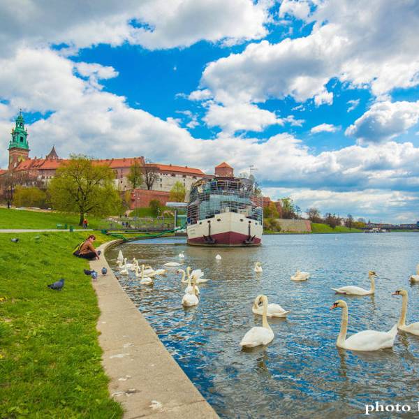 维斯瓦河中的天鹅不怕人,这里的人们环保意识很强,经常有人喂食天鹅。瓦维尔城堡位于维斯瓦河畔