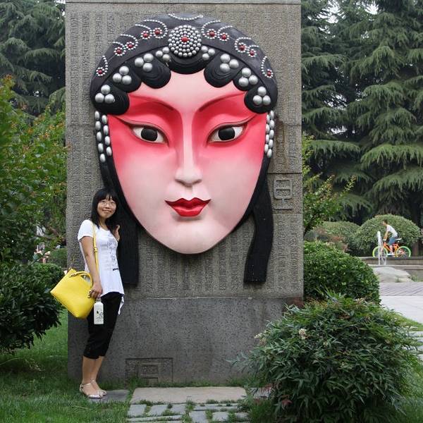 而戏曲大观园的门口立着的就是“生、旦、净、丑”角色的脸谱雕像,小妮子兴奋的跟它们合影留念。附上一张旦角的: