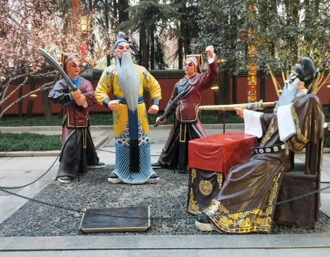 陕西戏曲大观园在大雁塔北广场东边,唐大慈恩寺遗址公园对面。和陕西民俗大观园相呼应,园区不大,园内同样是各种人物雕塑,这里以戏曲为表现主题特色。里面有一些脸谱和秦腔戏目的人物雕像表现刻画得形象而又丰富有趣,各具神采。来大雁塔的朋友可顺便来这游览感受下陕西地方特色戏曲文化的魅力。