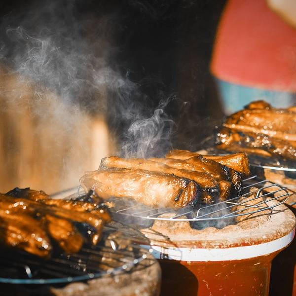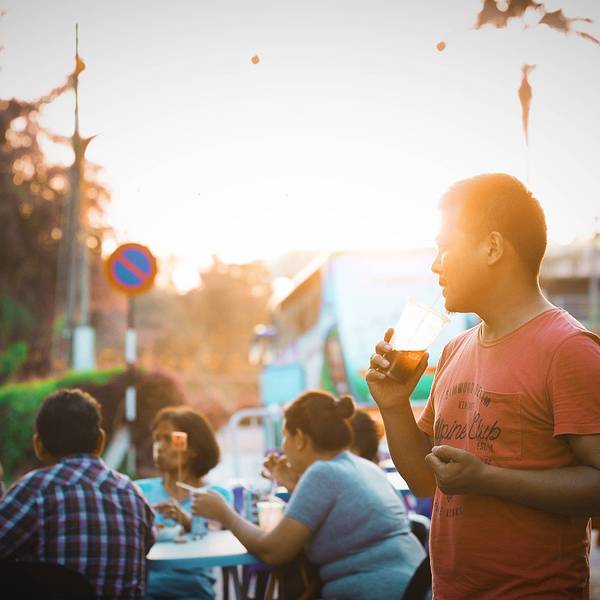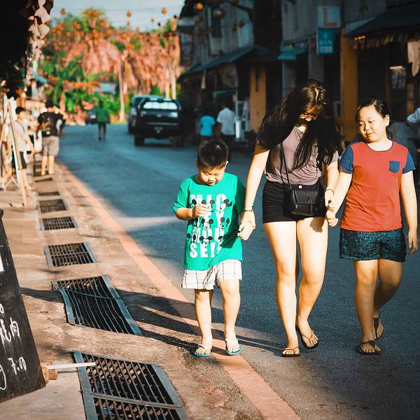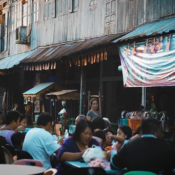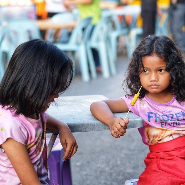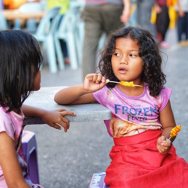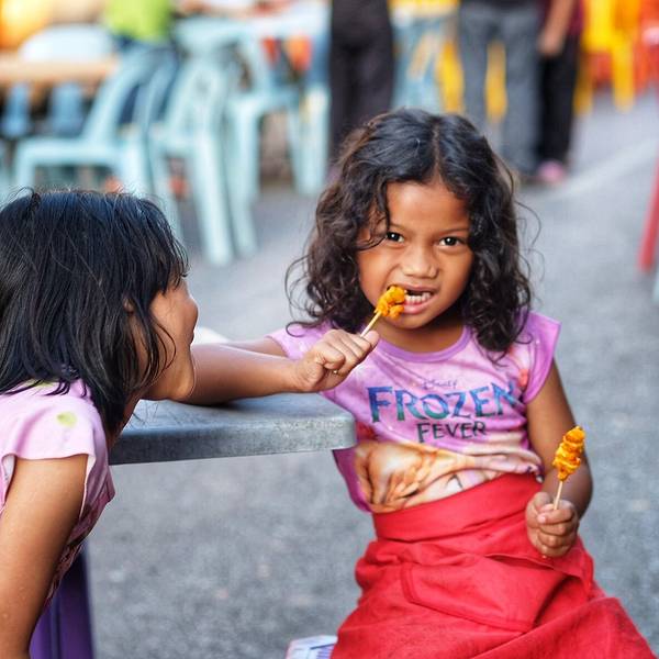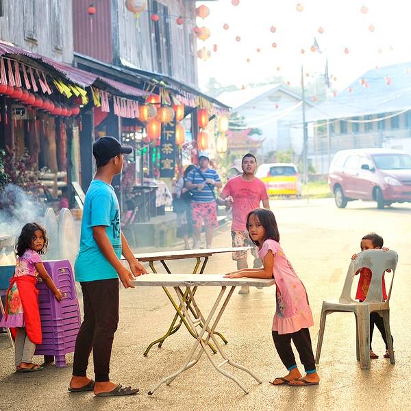 古晋新尧湾,一个拥有超过百年历史的老镇,曾经一度被时代所遗忘。老街夜市只有短短两排,古色古香的双层楼木板老店却远近驰名,吸引不少客人特地前来,在这里可以品尝不同风味的美食,更可以享受日落后华灯初上时亲朋好友相聚的热闹。这条短短的老街,以夜市文明,周末夜里人山人海,非常繁华,黄昏时确实休闲慵懒的一面。还没天黑,烧烤的摊位已经开始将食材拿到街面,散发着诱人香味。古晋本地水果不少,一定要推荐红毛丹。这么美好的黄昏,随手一拍都有逆光小清新的感觉。因为是传统的夜市,大多是家庭式经营,所以小朋友们也要来帮忙哦。帮忙摆好了桌椅,奖励吃两串烤串。小卷妹纸的内心戏可能是,这么好吃,我才不要分给你。推荐必吃的是猪笼草饭,这可是用上午我们在实蒙谷看到的猪笼草晒干,做成“器皿”,装上糯米饭而成的。猪笼草的青草香加上糯米、椰汁的香味,吃起来想到特别。另外就是茄汁粿条和三色奶茶。 茄汁,就是西红柿做的酱汁,粿条源自于中国潮汕地区,其实就是河粉(宽米粉),这是看似家常的一道菜,却是砂拉越传统的地道食物,先将特制的粿条炒香后再淋上茄汁,浓汁惹味。而这种拥有三种颜色的饮料叫三色奶茶,它是由最上面一层的红茶和中间一层的奶还有最后一程的红糖组成的,喝起来爽口甘甜,还夹杂着奶香味,非常值得尝试。夜幕降临后,真的是热闹非凡,朋友间相聚,喝喝小酒,或者高歌一曲,你来我往间,是浓浓的人情味。