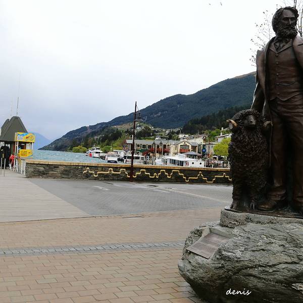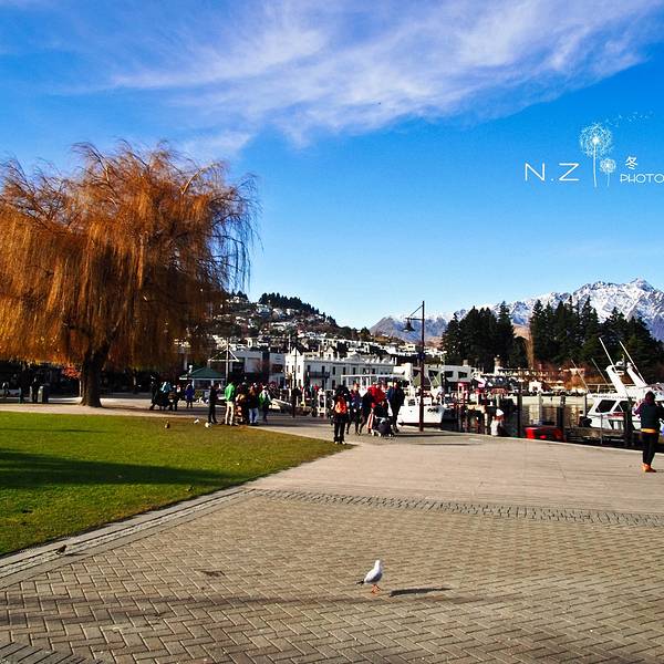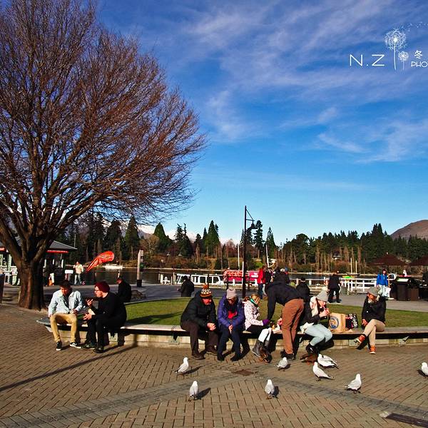我们离开皇后镇的时候寒风还很凛冽,等我们从船上下来时,空气已经十分温暖。湖边的休息区坐着三三两两的人们,或聊天,或喂食……感觉世界那么宁静而美好。那么多人热衷于皇后镇,除了湖光山色,探险刺激,是否有着有像我们一样温暖的情怀呢?皇后镇中心很小,从头到尾逛完也就30分钟左右。街上的商店以卖户外装备居多,也有卖纪念品的,每拿到一件商品,我和伙伴都习惯性的翻看商标,每当看见made in China时,一种生为中国人的自豪感便油然而生。当然我们绝对不会买一件made in China的产品回China的