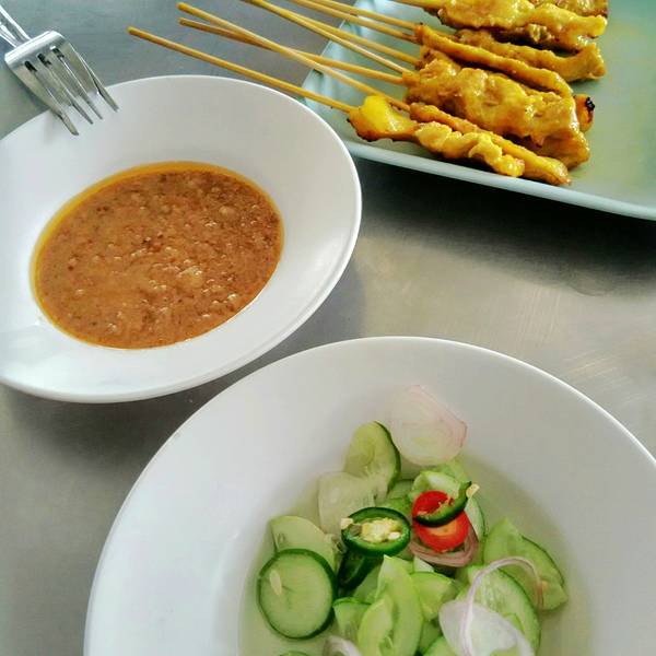 这家在夜市附近,从mini vanbus 车站出来就能看到,因为找了司机下午包车,司机推荐这里吃饭,当地人很爱吃的地方。面积不大,开放式的那种,比附近的几个摊子人多,感觉像是被承包的美食街似的,中午人不多,让我误以为是家不太火的店,看过别人照片才发现,那么火。 离住宿的查来拉恩酒店很近,一个路口,门口有很多小摊,结账之后可以在店里堂食,店里还有柠檬茶奶茶可以点,中午饭口可做的东西种类比较少,以旁边小吃为主。 环境吧,比较简朴,几乎是开放式的摊位,只是有顶棚罢了,华欣饭店基本都是这种形式,卫生状况还不错。服务吧,因为语言沟通问题,所以服务神马的真心感觉不到。摊位附近没有牌子标示价格,我只好拿着50或者100的泰铢,拿出来晃一晃,对方冲我点头,35一份,还是很有性价比的。 水门鸡饭,虽然没在水门吃,但是这里的倒是可以试试,35泰铢一份,7块钱,鸡肉一大块,原味的,蘸料很特别,强烈建议加了蘸料配米饭吃,要不原味鸡肉实在没啥可吃的,比旁边7-11的鸡腿饭好吃太多。 沙嗲鸡肉串,好多串,还都是肉,甜辣口味的,有蘸料,还有泰式小沙拉,竟然还是35泰铢的好价格,很有性价比,推荐。 泰式奶茶,这家的奶茶只能说还好,没有在曼谷过来的mini van bus车站门口那家好喝,冰块是碎的,口感会好很多,茶味重。 柠檬茶,因为附近的koti营业时间晚,只好在这家解柠檬茶的馋,但是味道普通,35泰铢,有点酸涩的口感,包装倒是很好看。 总体来说是在附近住值得试试的一家,有性价比,很舒服的路边摊。水门鸡饭,肉不错鸡肉串套餐,太华丽了,关键是还很便宜泰式奶茶柠檬茶