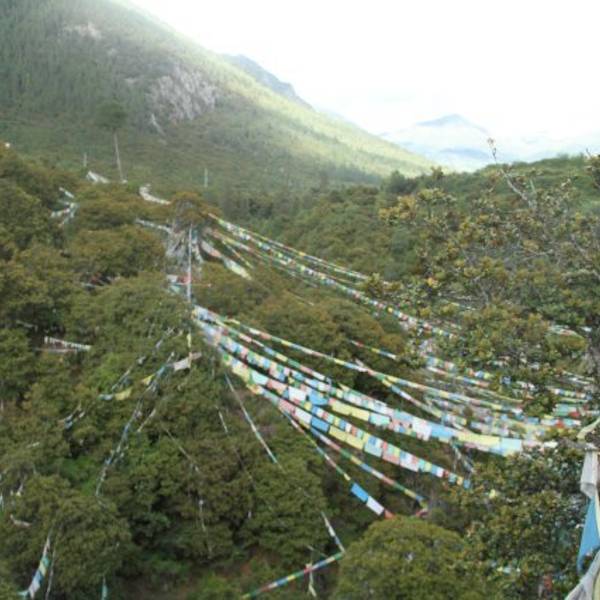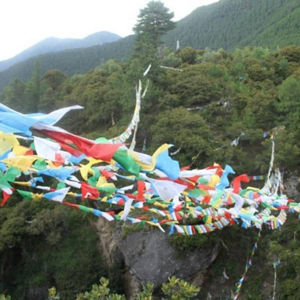 我们三人在说笑打闹中爬山,终于到了山顶。山上有一间比日神阁,房门紧锁。旁边是一户人家,经营着小商店,可以补给水和食物。然后沿着商店背后的一条木板铺的小路转山。路两边五颜六色的经幡随处可见,寄托着祈愿人美好的祝福。一路上几乎无游客,拍照玩耍简直爽翻了。