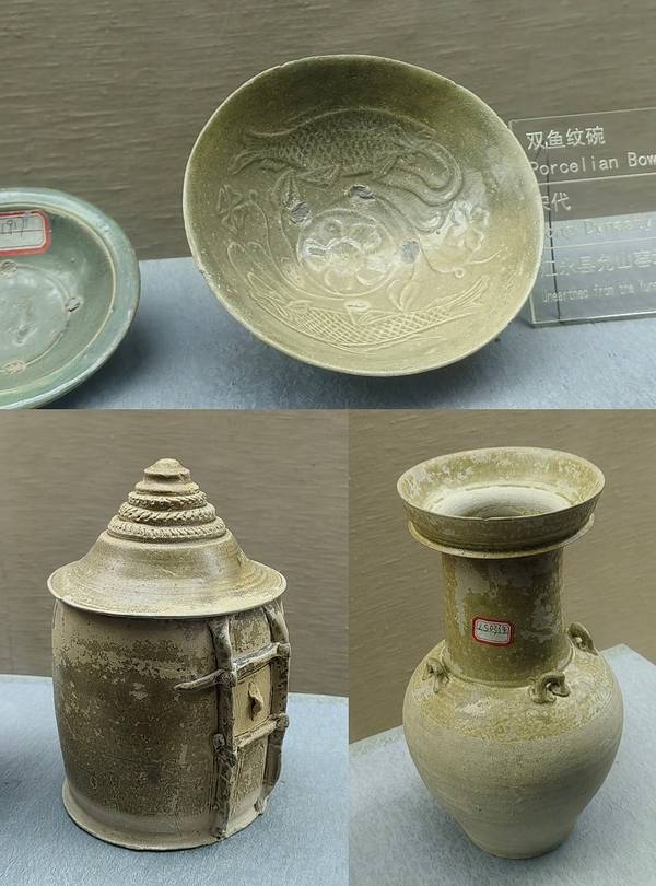 西汉淡绿色琉璃猪、东汉滑石面具、战国蜻蜓眼琉璃珠,鬼崽岭祭祀遗址出土石像,西汉束腰形金鼻塞