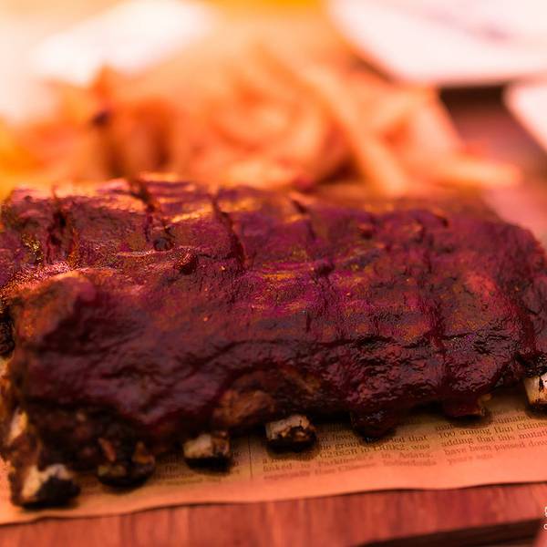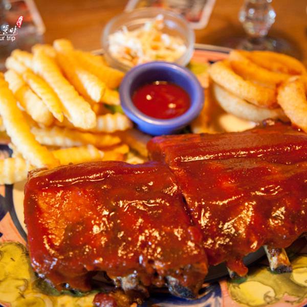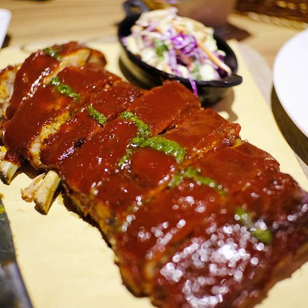 烟熏猪肋排(450 元),以多种香草、苹果醋、橄榄油、鲜橙汁, 经 24 小时冷泡;入烤箱前再使用特…