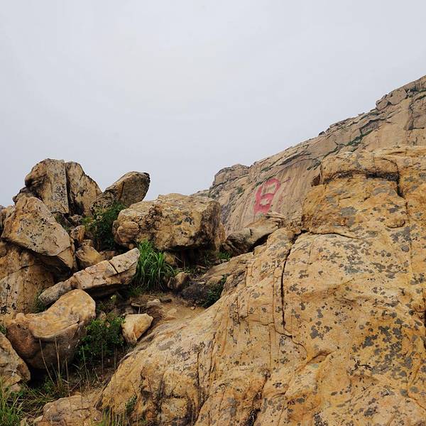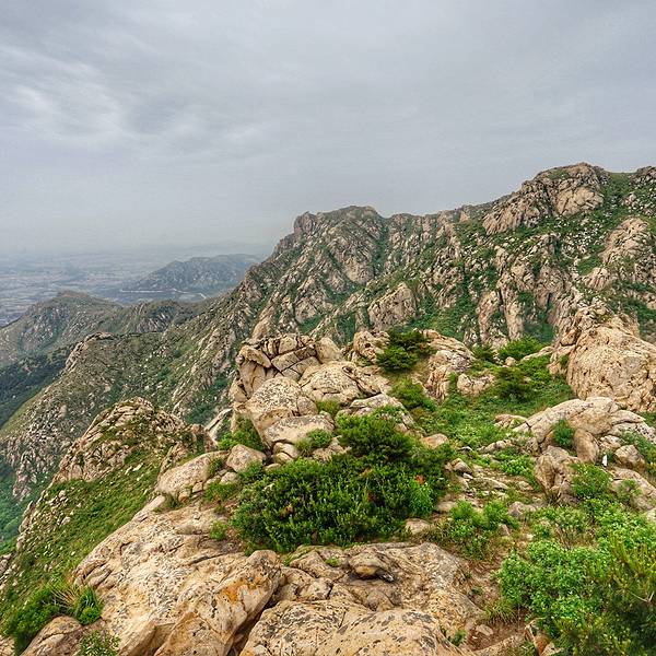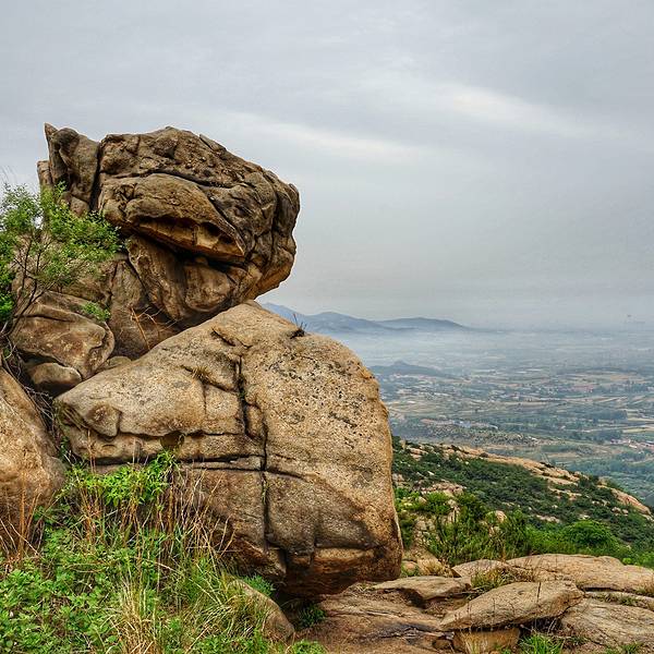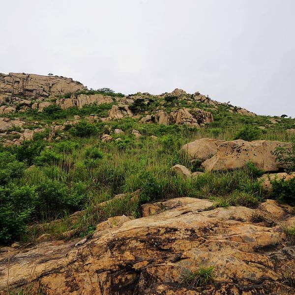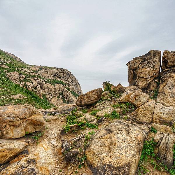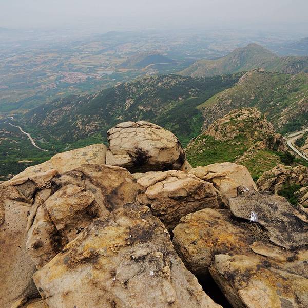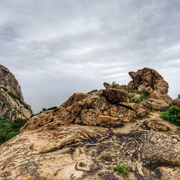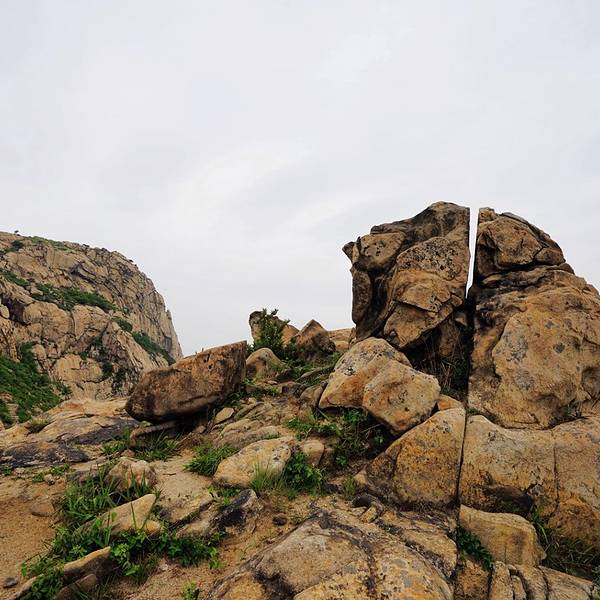 据说山顶是有些古迹的,但我们一路走来并没有看到什么东西,只有嶙峋的石块和低矮的植被。山顶天然形成的大块巨石错落有致,形态各异。