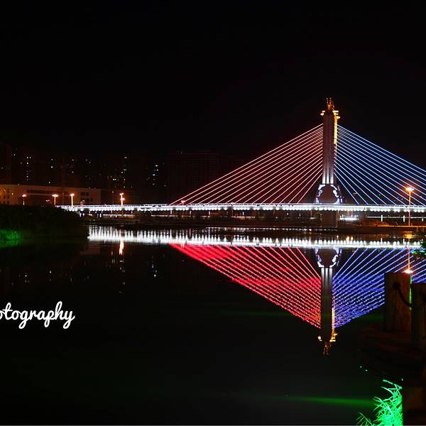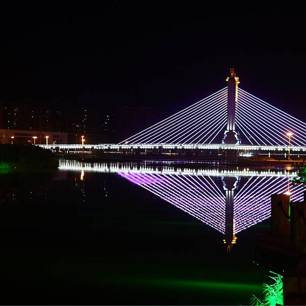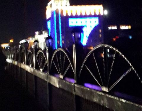 凑近围栏狂拍一阵,好多车车擦身开过。原来除了桥上走车,桥下有条像自行车道一样的窄的马路也是通机动车的,我这种行为还有点小危险呢。海拉尔夜晚的灯光还是非常给力的,高端大气。是不是很像钟楼?又觉得很像邮局……真怀疑哪怕跑遍全中国都会遇上广场舞,海拉尔自然也不例外。不过这里他们跳的是广播体操,就我们读书的时候跳得那种……麻麻看上去对广场舞也充满热情,平时在家不这样啊……莫非是压抑了天性?不远处就是另一座桥了,每座桥的特色还不一样。这座斜拉桥的钢索会变色的哦~颜色其实很多~还有绿的,黄的等等等…大杀器!两侧颜色还可以不一样哦,意不意外,惊不惊喜?中央桥充满了星光大道的feel~ 展开
