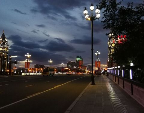 中央桥位于海拉尔繁华的胜利大街上,它虽然不是有名的景点,但是两边桥头各设有两座钟楼的建筑以及桥上两排欧式桥灯,感觉十分绚丽多彩。