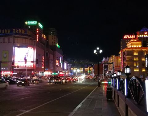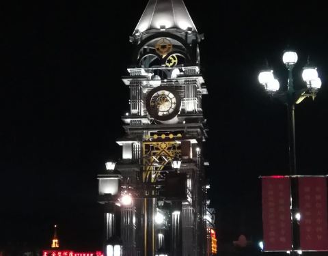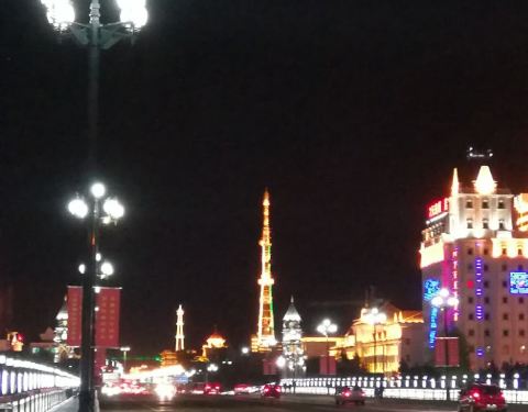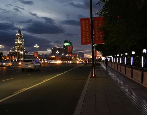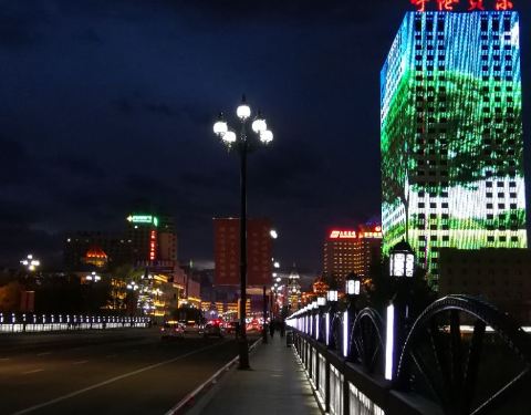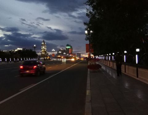 一条普通的跨伊敏河之桥,但这桥两头修搭起很欧式风的铁塔后,在夜里灯光下,显得十分有罗马情调。这离呼伦贝尔古城很近,可以逛完古城后来看夜景。