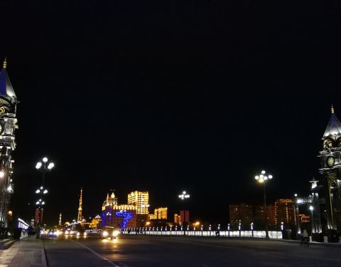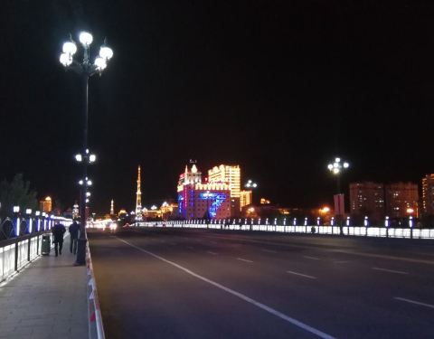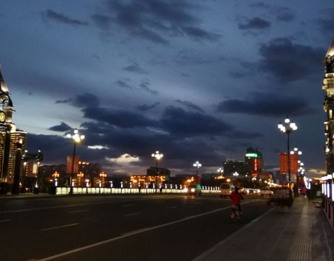 吃饱喝足例行是要散散步的,刷了下地图,附近有一座桥据说还挺美的,那就闲逛过去看看咯。顺便插一句,海拉尔主要有两条河,伊敏河和海拉尔河,两条相交的河上平行的架着好多桥(简直和首尔的汉江大桥一个套路……) 看到大桥的第一眼,恩,非常像哈尔滨,就是这个颜色,就是这个调调,钟楼一般的感觉。 凑近围栏狂拍一阵,好多车车擦身开过。原来除了桥上走车,桥下有条像自行车道一样的窄的马路也是通机动车的,我这种行为还有点小危险呢。海拉尔夜晚的灯光还是非常给力的,高端大气。是不是很像钟楼?又觉得很像邮局……真怀疑哪怕跑遍全中国都会遇上广场舞,海拉尔自然也不例外。不过这里他们跳的是广播体操,就我们读书的时候跳得那种……麻麻看上去对广场舞也充满热情,平时在家不这样啊……莫非是压抑了天性?不远处就是另一座桥了,每座桥的特色还不一样。这座斜拉桥的钢索会变色的哦~颜色其实很多~还有绿的,黄的等等等…大杀器!两侧颜色还可以不一样哦,意不意外,惊不惊喜?中央桥充满了星光大道的feel~