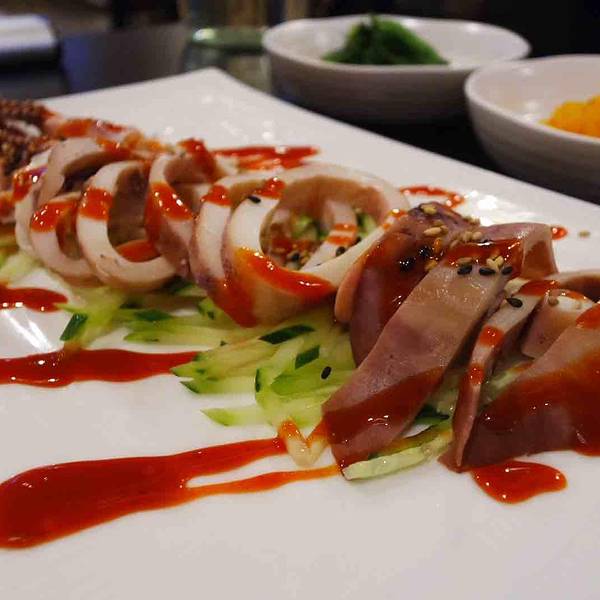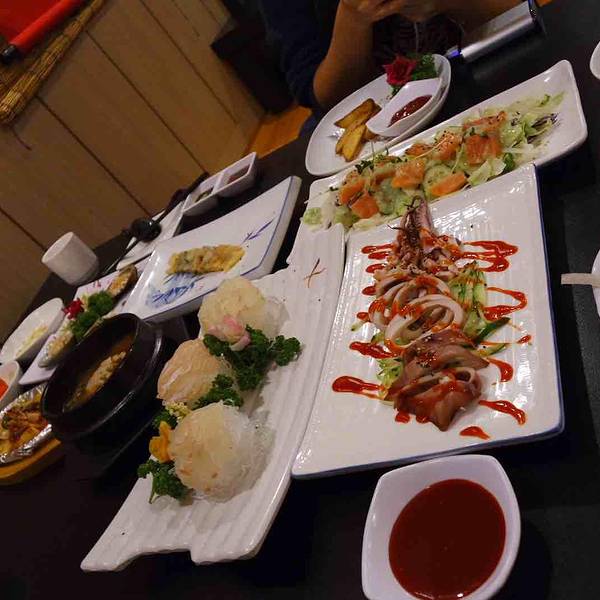 【关于味觉】:还没开始吃,就上来了一大桌子的海鲜料理。多宝鱼刺身,鲍鱼,章鱼,海鲜大酱汤等等。对于走了一天的我们来说,这些丰盛的前菜足以暖胃。前菜吃的差不多的时候,帝王蟹来了。美女店员端着一巨大的盘子走来。装了一大盘子帝王蟹!!!一个字:鲜!两个字:超鲜!!都是活的帝王蟹现做的。肉的含量90%以上。味道你们靠想象!反正一桌子吃的什么都不剩!!吃完后还有蟹膏炒饭!!炒饭配海苔,美味思密达!!最后还有老板带回来的石头老爷爷蛋糕,香香的