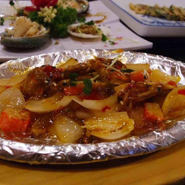 宝健路上人气很高的一家店,两个人点了个2公斤的帝王蟹。蟹肉鲜甜,肉质很有弹性,还送了一桌子的小菜,足够吃了。味道鲜美,非常好吃!