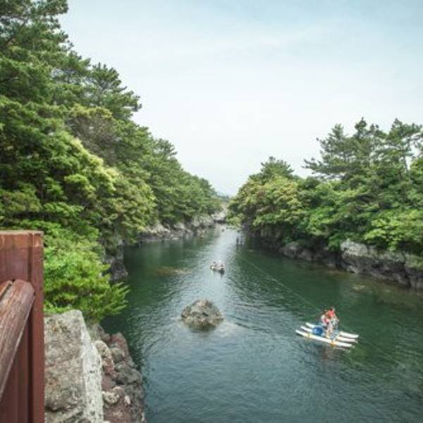 牛沼河口是西归浦七十里神秘境地之一,奇岩怪石与茂盛的松树形成绝佳美景,入海处还有黑色沙滩。这里有一种小型扁平名叫Tewoo的浮筏,可拉着绳索穿梭于透明清澈的水面上,欣赏各种造型有趣的岩石,游览牛沼溪谷各角落的风景。附近还有柱状节理带、中文海水浴场、天地渊瀑布等景点,可一同游览参观。这里还是济州柑橘的主要产地,景区可以买到“橘子水”,每到橘子收获,景区附近都会有果农售卖好吃的济州柑橘。