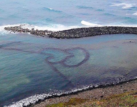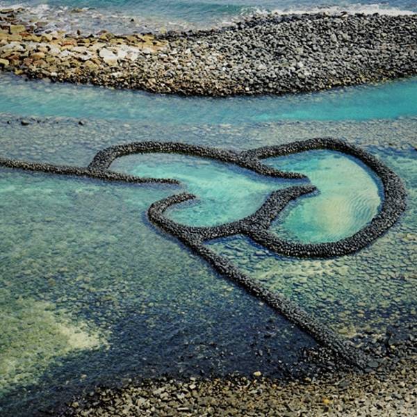 双心石沪在台湾澎湖东北面的七美岛上,石沪是台湾渔民筑成的墙形的堤坝利用潮水的涨落来进行捕鱼的装置,在常年的捕鱼过程中形成了心形的形状逐渐发展成为了景点。