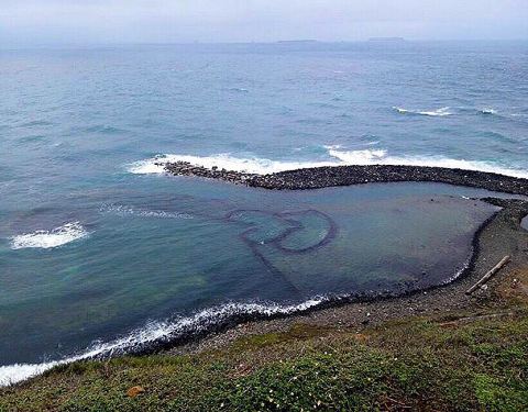 双心石沪在台湾澎湖东北面的七美岛上,石沪是台湾渔民筑成的墙形的堤坝利用潮水的涨落来进行捕鱼的装...