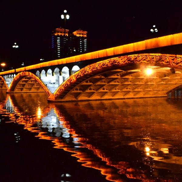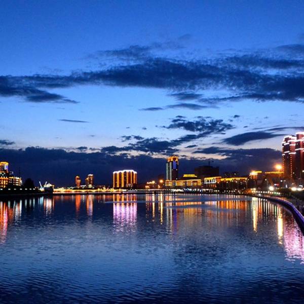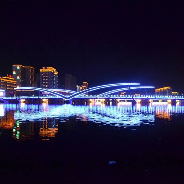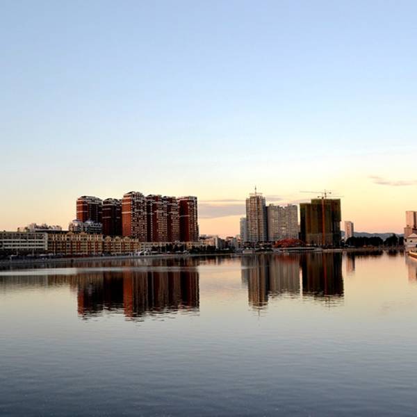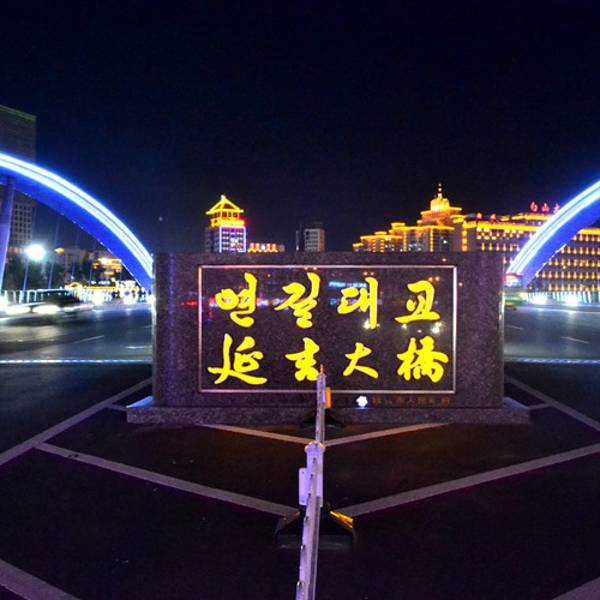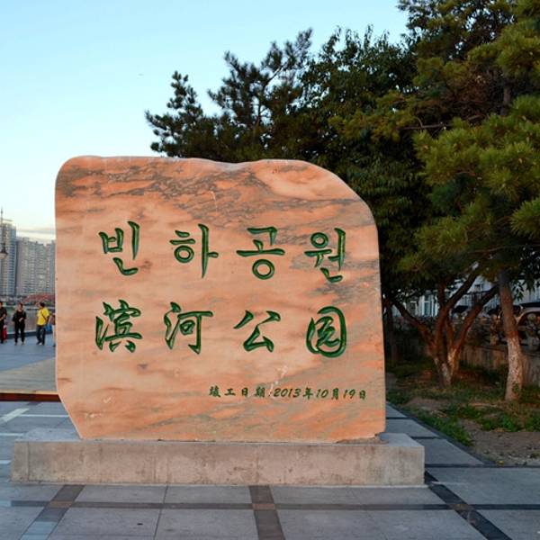 12:00时在珲春吃过旅行团的最后一餐中饭,大家互相告别后,搭乘到延吉的大巴返回延吉。 17:35时我来到滨河公园。只见布尔哈通河将延吉城区一分为二,在布尔哈通河上建有多座大桥,从延吉大桥至新民桥之间,全长近4.85公里,这一段就是滨河公园。每当夜幕降临,华灯绽放,两岸灯火璀璨,楼体掩映在波光粼粼的河水中,若隐若现的金色、紫色……五彩缤纷的光芒,给夜色中的城市增添了靓丽的景色。