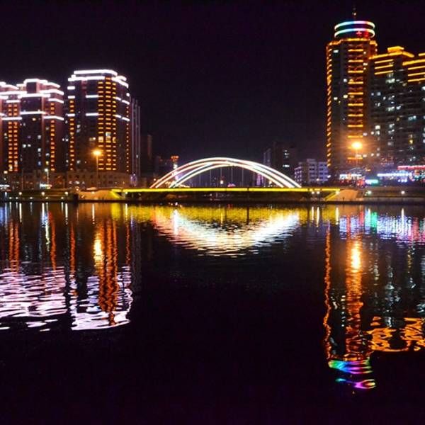 两岸灯火璀璨,楼体掩映在波光粼粼的河水中,若隐若现的金色、紫色……五彩缤纷的光芒,给夜色中的城...