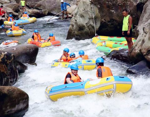 5.漂流船通过险滩时要听从工作人员的指挥,不要随便乱动,应紧抓安全绳,收紧双脚,身体向船体中央倾斜;