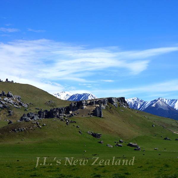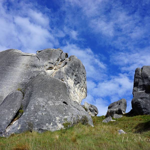 关于第二站的Castle Hill,我的本意是停车场里瞥一眼拍张照到此一游即可,当拿着相机装模作样时,经过4位老爷爷老太太冲我俩微了那么一笑就拄着拐杖往里走去了。于是,我被某童鞋拉去开始新西兰的第一场短途walk。走近看时,满山的天然岩石还是颇为壮观,曾经作为毛利土著挡风遮雨的天然庇护所。爬到高处会有这么一处地方,你的四周被硕大的岩石围绕,而外圈则被连绵的山脉围绕。回程的时候看到刚才的一位老太太,自己带着户外椅支在树荫下,边看书边等候老伴朋友们。心中立马闪出一句广告语:退休生活的最高境界,新西兰,能为你实现!