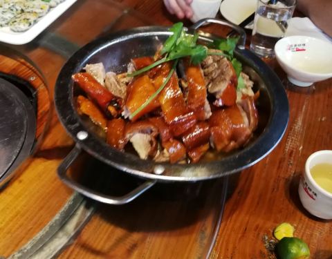 他家就在椰庄对面,里边的脆皮鸭超级好吃,好像最低消费300,吃的比较实惠,我们五个人吃三百就够了!