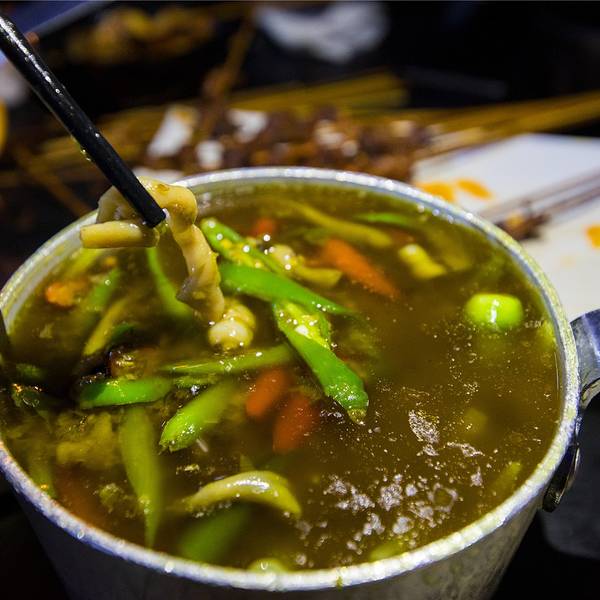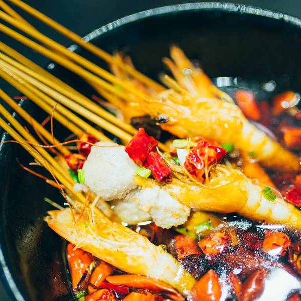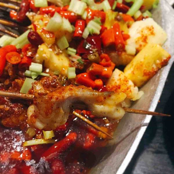 成都号称天府之国,这里一直都是人们向往的宜居之地。而谈到宜居,不仅是这里有怡人的自然环境,美食的诱惑也是成都被国人所津津乐道的元素之一。说到成都的美食,我们第一印象肯定是川菜,味蕾瞬间想起那些关于麻辣的滋味,不自觉的口水涌动!然而作为八大菜系之首的川菜,如今也是分裂出来很多新派的模式。不仅如此,一个地方的味道还融入到很多日常的饮食中,诸如烧烤就是最典型的例子。每个地方的烧烤口味不禁相同,而作为川系的烧烤,自然逃不了以麻辣为主咯。在成都两天,品尝了两家店,在此为大家逐一介绍。 成都吃客 这是一家新派川菜创意小馆,老板做餐饮17年,以前是粤菜顶级燕鲍翅师傅,23岁转型专研川菜!说到他新,是因为他的菜品有些确实不是正宗川菜体系里的,然而又把他归于川菜创意馆,是因为不管是如何的新颖的创意,最终还是留给食客麻辣鲜香,这是川菜的真谛!来看看他的新,用海鲜配上麻辣可谓是川粤结合的佼佼者。这道菜名叫裸奔坨坨虾,名字就很奔放啊。把白灼虾穿成串,然后在麻辣锅底里焖煮,让虾子完全的侵入锅底的精华味道。这道菜吃起来,既保留了虾子本有的海鲜鲜味,也掺杂着川菜里精髓的麻辣,两者完美结合,可谓浑然天成,口感不错!特别说明下,这道菜的打底是用的芋儿,一定要记得用筷子在砵底捞一下哟,很软,吃起带劲!接下来我要重点推荐一道菜了,名字叫特色烤鱼片。首先不说味道,我想说的是这道菜是一道一分为二的菜品。这是什么意思呢?简单的说,就是一鱼两吃咯!先把鱼肉剔出,穿成串,用泡椒味覆盖,烤鱼片的特色就是让食客即能体验到鱼片的嫩滑爽口,又能从泡椒中体会到酣畅淋漓。这是第一种吃法。第二种就是把一条鱼剩下的部分拿去熬汤,汤中加入酸菜作为主要调味元素,一锅酸菜鱼汤就能呈现到面前。这道菜的特色首先是清淡,酸菜虽然在腌制过程中会有一定的辣椒元素,但总体来说味道都不会太浓,可供不能吃辣的人群享用!鱼汤可口,老少皆宜!总体来说,新派川菜,重点还是突出川菜的特色,这是小店的灵魂。至于菜品的出新,那就看老板的脑洞,以及胆略的大小了。其实四川人讲究的是味道,不太在乎环境,服务。只要能抓住我的味蕾,我就算受气,也一定会再次光顾。