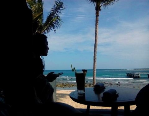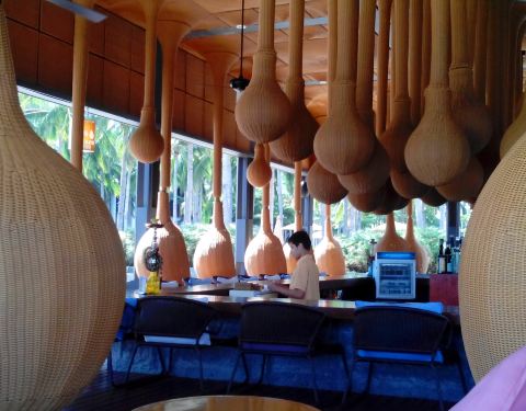 自从看到这个沙滩吧的许多照片后,就想来亲自坐一下~所以某个下午,妈妈和宝宝在酒店休息,我拖着老公去我垂涎很久的半山半岛洲际的沙滩吧。半山半岛洲际在小东海,从我们住的半山锦江旁的小路继续向深处开。大东海是很热闹的市区,进入半山的路其实就已经转为幽静了,前往小东海的一路山路则更加幽静。小东海老公说感觉像迪拜的富人区,很多漂亮的现代高楼住宅,人却很少。开个世纪联华,走进去不像联华超市,倒像city shop的氛围。喜欢这一个个巨大的果子一样的悬挂。非常有特色。这里么,其实就是吃环境啦,饮料的味道能有多特别呢,还超贵,一杯忘记了什么的饮料65,再加15%的服务费,老公还舍得买给我喝,哎~不过海景无敌~一杯饮料,躺躺晃晃,看看蓝色的大海,吹吹海风,一个悠闲的下午。