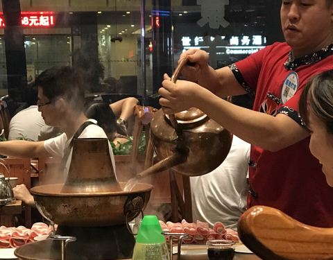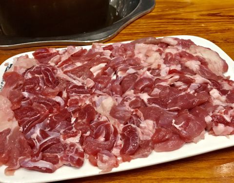 这家经常从门口路过,这次进来试试。 门口能听见几只蝈蝈的叫声,很有北京人的气息。估计是从北京带过来的,因为广东没有这种鸣虫。 大堂很大,就餐的人很多,生意很不错。我点的是手切羊肉个手切外脊,肉都很好。 调料是北京涮羊肉传统的麻酱料,免费配了8种小料,韭菜花和腐乳是要加的,其实这八个小料外,还可以加一点陈醋…… 火锅是铜锅,水开的不错。 先吃肉,最后再煮豆腐等,豆腐飘起来就可以吃了…… 小建议:总体满意,夏季空调要再足一点,排风再好点。