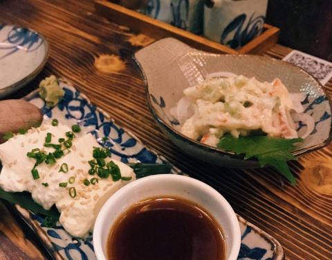 早就听说江安路上有家居酒屋,非常不错,被朋友圈一遍遍的种草,这次终于过去拔草啦 深夜小食堂,主要做日式炭烤类的,所以白天不营业,只有晚上开 店铺很小,座位挤在一起,吧台前挂满了日语写的菜单,是有那么些日式小居酒屋的感觉 手作芝士豆腐,必点之物,原本想着就一豆腐能好吃到哪里去呢,尝了才知道,口感实在太美妙了,豆腐的口感、芝士的口味,巧妙的融合在一起,真有种在吃甜品的幸福感 鲜嫩鸡肉刺身,秘制的生鸡胸肉,吃起来一点都不腥,肉质非常细嫩,原来鸡肉刺身也是能做的如此美味 南蛮风鸡腿,本来以为是一整个鸡腿,其实是酥炸鸡腿肉,量好大,两个人一份有点吃不完 炭烤骨肠,之前在另一家日料店尝过烤骨肠,印象很好,想试试味道,这家的肉肠肉质不同,各家做法不同,肉汁咬的时候还飙出来了,别看个头小小的一根,肉还是很扎实的 炭烤芝士牛油果,牛油果都是直接切开拿勺子舀着吃,烤着吃还真没试过,原本一直想着水果加热后能好吃吗,没想到这味道还真是特别多好,中间的核去掉后加入了芝士,烤的香味四溢 狗猫君烤饭团,饭团也是日料里代表性的一种主食,外表酥脆,蘸了一点点酱油调味,这个饭团里面是没有馅的,就是烤的略带油 梅子茶泡饭,茶泡饭也是第一次尝,梅子很酸,非常开胃,不过对于不爱吃酸的人来说还是避开吧,茶泡饭后的汤变的非常好喝 黑子蛋糕,招牌,就是冲着这个来的,其实是抹茶巧克力蛋糕,不甜腻,不过个人感觉抹茶味还不够些,心心念念的甜品似乎没有想象中那么惊艳 梅酒,日式清酒个人还是蛮喜欢的,清爽可口,度数不高,特别适合女生 老板娘是个温柔的美女,每天晚上顾客满堂,如果不定位的话一定要早点去,不然肯定没位置