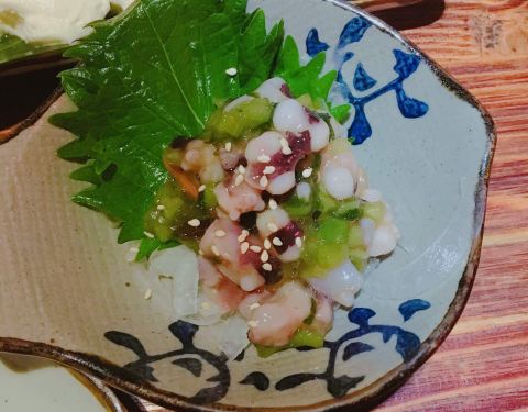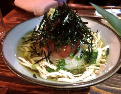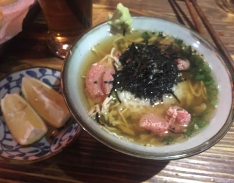 早就听说江安路上有家居酒屋,非常不错,被朋友圈一遍遍的种草,这次终于过去拔草啦 深夜小食堂,主要做日式炭烤类的,所以白天不营业,只有晚上开 店铺很小,座位挤在一起,吧台前挂满了日语写的菜单,是有那么...早就听说江安路上有家居酒屋,非常不错,被朋友圈一遍遍的种草,这次终于过去拔草啦 深夜小食堂,主要做日式炭烤类的,所以白天不营业,只有晚上开 店铺很小,座位挤在一起,吧台前挂满了日语写的菜单,是有那么些日式小居酒屋的感觉 手作芝士豆腐,必点之物,原本想着就一豆腐能好吃到哪里去呢,尝了才知道,口感实在太美妙了,豆腐的口感、芝士的口味,巧妙的融合在一起,真有种在吃甜品的幸福感 鲜嫩鸡肉刺身,秘制的生鸡胸肉,吃起来一点都不腥,肉质非常细嫩,原来鸡肉刺身也是能做的如此美味 南蛮风鸡腿,本来以为是一整个鸡腿,其实是酥炸鸡腿肉,量好大,两个人一份有点吃不完 炭烤骨肠,之前在另一家日料店尝过烤骨肠,印象很好,想试试味道,这家的肉肠肉质不同,各家做法不同,肉汁咬的时候还飙出来了,别看个头小小的一根,肉还是很扎实的 炭烤芝士牛油果,牛油果都是直接切开拿勺子舀着吃,烤着吃还真没试过,原本一直想着水果加热后能好吃吗,没想到这味道还真是特别多好,中间的核去掉后加入了芝士,烤的香味四溢 狗猫君烤饭团,饭团也是日料里代表性的一种主食,外表酥脆,蘸了一点点酱油调味,这个饭团里面是没有馅的,就是烤的略带油 梅子茶泡饭,茶泡饭也是第一次尝,梅子很酸,非常开胃,不过对于不爱吃酸的人来说还是避开吧,茶泡饭后的汤变的非常好喝 黑子蛋糕,招牌,就是冲着这个来的,其实是抹茶巧克力蛋糕,不甜腻,不过个人感觉抹茶味还不够些,心心念念的甜品似乎没有想象中那么惊艳 梅酒,日式清酒个人还是蛮喜欢的,清爽可口,度数不高,特别适合女生 老板娘是个温柔的美女,每天晚上顾客满堂,如果不定位的话一定要早点去,不然肯定没位置