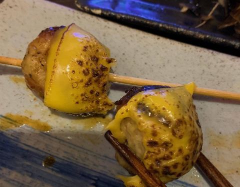 炭宗(江安店) 江安路453号(来福士广场旁) 熔岩土豆泥 总体蒜味会重了点,蒜泥酱过于辛辣稍稍带苦,吃的时候扒拉了点掉。土豆泥用黑胡椒美乃滋调味,入口细腻层次丰富,大概是从冰箱里拿出来,入口冰冰凉凉的。溏心蛋是心头大爱,就着土豆泥一起很满足。 炭烤多春鱼 烤制后的多春鱼淋上柠檬汁,不会那么油腻。 炭烤牛舌 酱烤的牛舌不腥,但薄切的牛舌有一些老。 炭烤鸡心 鸡心处理的很干净,带着一丝甜味,推荐。 炭烤鸡皮 烤焦的鸡皮,香脆美味,但相对于酱烤,我还是更喜欢盐烤的。 炭烤鸡软骨 一小串的软骨很有嚼劲。 炭烤鸡腿肉 鸡腿肉很大块,夹带着鸡皮,对于我这种食肉动物还是更爱这种。 炭烤明太子西葫芦 超爱超推荐,咸鲜口的明太子附在甜口西葫芦上,口感丰富,明太子入口一抿即化,嚼着脆脆的西葫芦,西葫芦也变得风味十足。 芝士鸡丸 调味后的鸡丸,肉糜细腻,但总体偏咸,配上了奶香味十足的芝士片。 芝士牛油果肉卷 烤制后的牛油果,口感更加绵密,和芝士融合的很好。