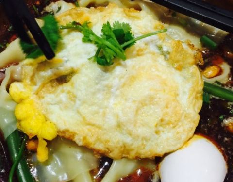 去的时间比较早,小店没什么人,桌子椅子都很卫生的模样,没有那种油腻感我就已经很满足了。菜品大概都是小面呀抄手呀盖饭之类的,我要了个普州抄手。看着是店里的老奶奶包的,肉还算蛮新鲜的呢。抄手的皮比较软,没有那种面粉坨坨的样子,滑溜溜的,肉虽然不是很多,不过就是那种刚好的模样。汤我说辣椒少放点,其实还是有些麻,味道很足,这个雨天吃得非常惬意。